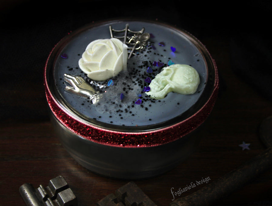 Candela artigianale in profumata cera di soia dal diametro di circa 7 cm e altezza 4 cm, ispirata all’estetica gothic fantasy. La superficie presenta una raffinata composizione con teschio e fiore bianco, mano di strega e ragnatela, su base grigia con glitter e cuoricini viola per un'atmosfera misteriosa e suggestiva super glamour. Rifinita con scintillante nastro rosa corallo è perfetta per arredare gli angoli di case stregate, tavolini oscuri, librerie magiche o come decorazione di Halloween. La candela è un piccolo oggetto d’arte, pensato per chi desidera portare magia e personalità in casa e simboleggia il dualismo vita-morte e l'idea di bellezza decadente, ideale come idea regalo originale per chi ama l’occultismo, il mood gotico e il design alternativo ultra chic