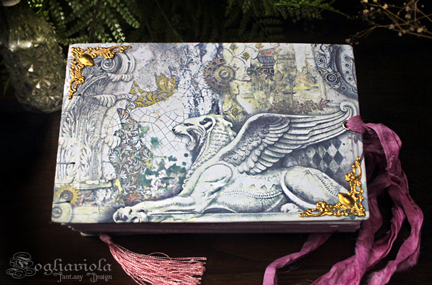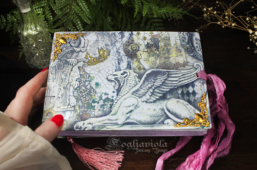 Il Grifone è un classico dell'universo fantasy che rivive in questo diario artigianale di 19x13x5 cm. Quasi 300 pagine di cartoncino spesso di recupero tagliato a mano e rilegato con filo cerato in tecnica copta per facilitare la scrittura a destra e sinistra (particolarmente utile su libri bianchi con tante pagine come questo). Decorato con angoliere filigranate color oro e da una chiusura a doppio nastro di seta indiana (da coop. equosolidale) color ciclamino, ha un segnalibro con elegante nappa rosa e una forma allungata che lo rende ancora più unico e distintivo. Decora la tua scrivania. Trasforma ogni pagina in uno spazio incantato dove i tuoi pensieri prendono forma e la magia quotidiana prende vita.
